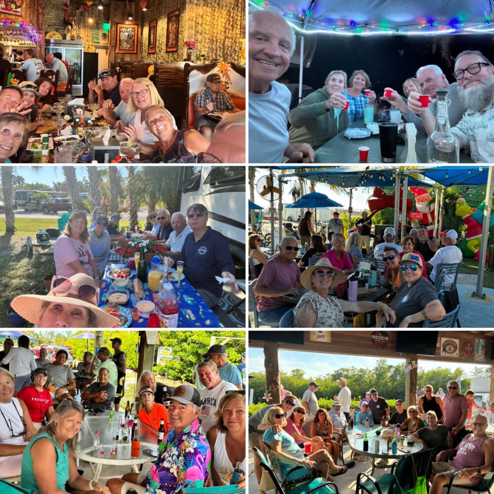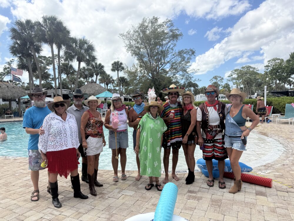At BlueWay we have met so many wonderful people who like us just want to have fun. Seems every year the group expands, many of us doing different activities together. What gives me most pleasure with all these people is their enthusiasm to engage in the theme pool parties; their imagination to invent new activities (we had our own Olympics), take part in the many activities like Euchre and art projects; the comradery when sorrow hits (beloved family members pass on or beloved pets die); many a night huddled by the warmth of the propane heaters playing games and just their genuine kindness. What is so miraculous is that the political views (and believe me we are all over the board on this one) was left behind when we all traveled south to winter and blended as one. I do remember one evening very early on, the talk drifted towards politics and just as like that the group was silent broken by a fart or burp, don’t remember which, and politics was never spoken again.